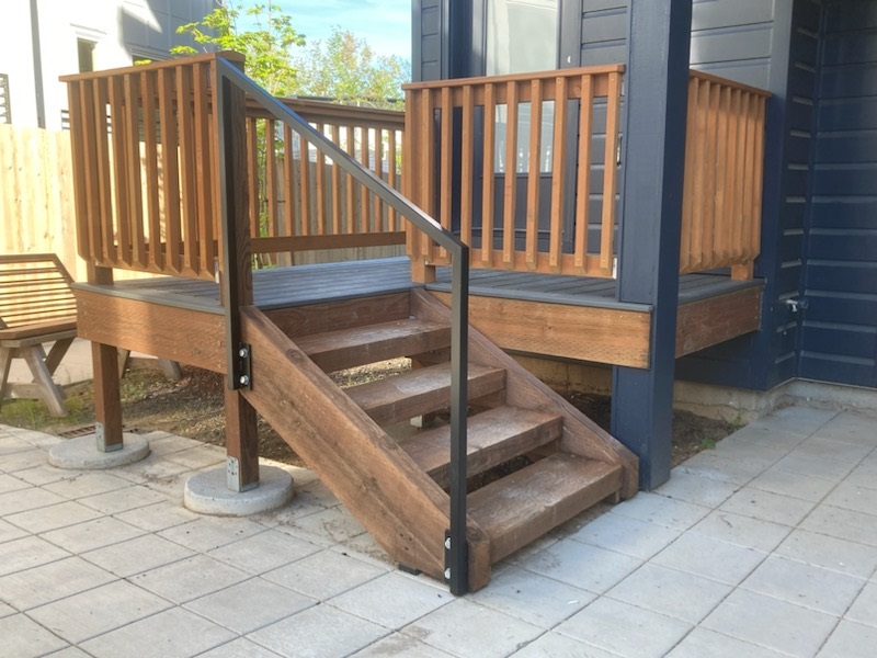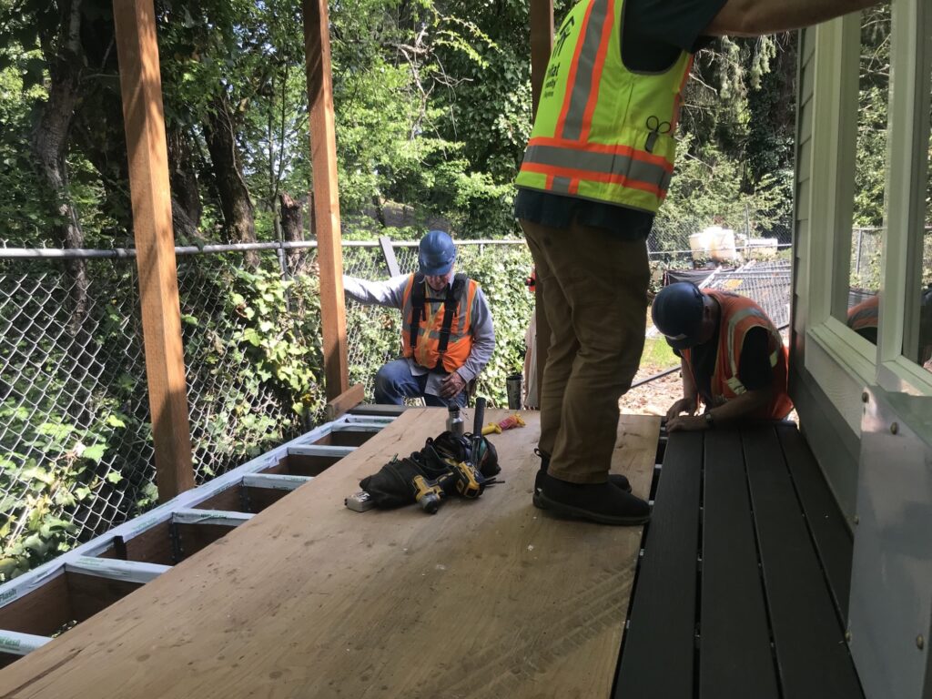 The Wednesday volunteer group was proud to install Trex on the deck for Building 7. The day it was completed was a momentous one in a couple other ways as well: the site’s last 4 certificates of occupancy came in, and it was also the sendoff for Flora Lang, the assistant site superintendent, who is leaving to study sustainable building. Thanks to the help of Flora, other Habitat staff, and volunteers, the Cherry Blossom project is expected to be completed in the next two months.