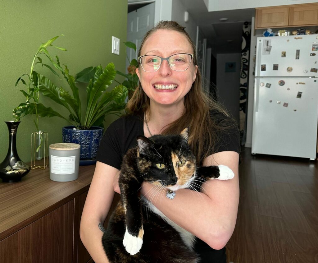 Alex holds her cat in a warm, sunlight living room, surrounded by bright green plants in a clean home. These two have been through a lot together: from homeless to homeowner, and everything in between.