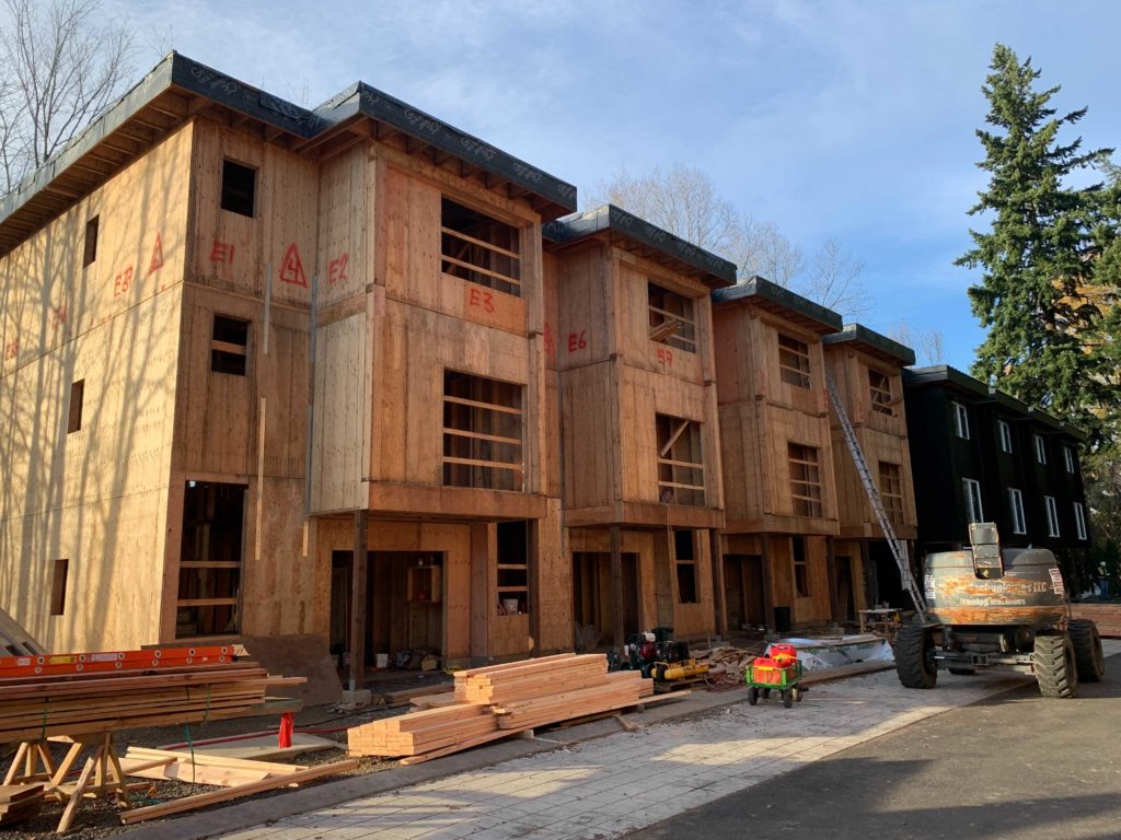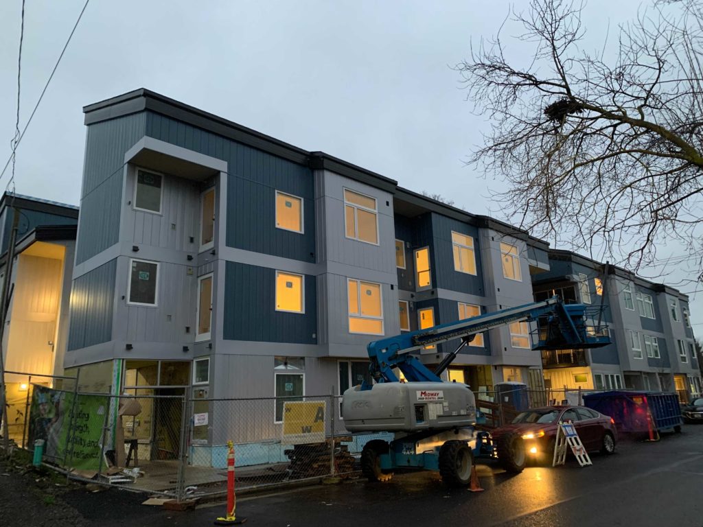 This spring, we are continuing exterior and interior work on this 31-home community in SE Portland, which will consist of four four-plexes, five five-plexes, and one single-family home. Our crews have just finished interior cabinets and trim. On the exterior, we’ve completed siding, roof installations, plumbing, heating, and electrical. We are putting the final touches on rough-ins at some homes, including bringing in and installing mechanical lines to install through the homes.