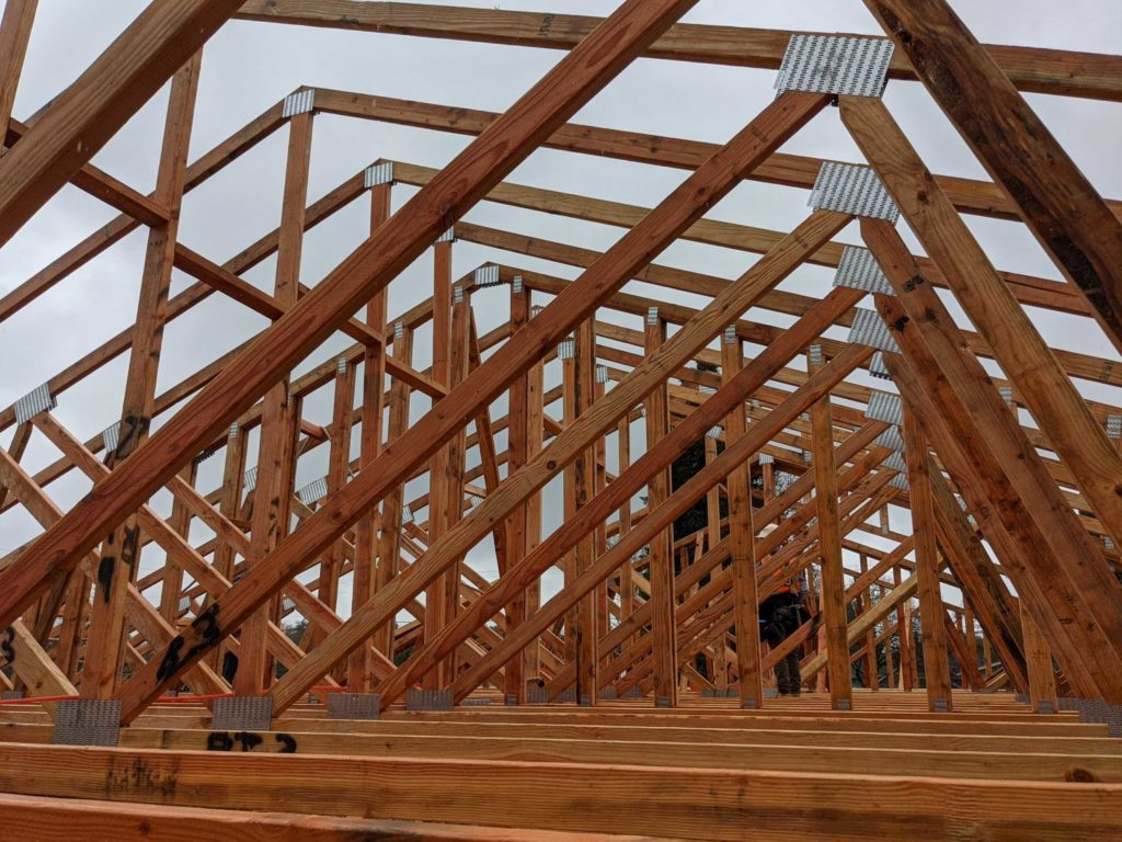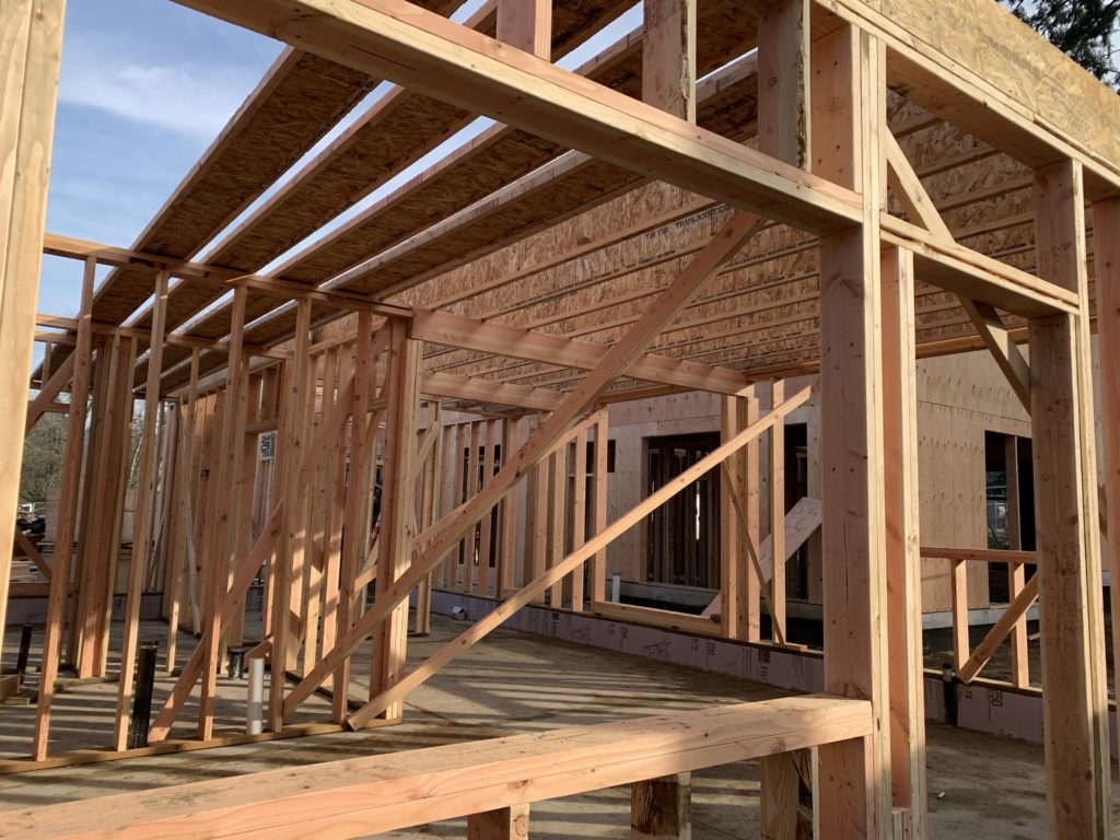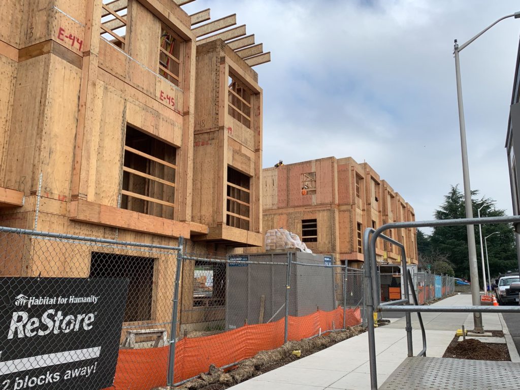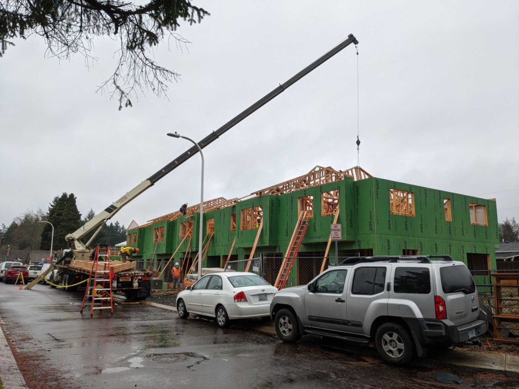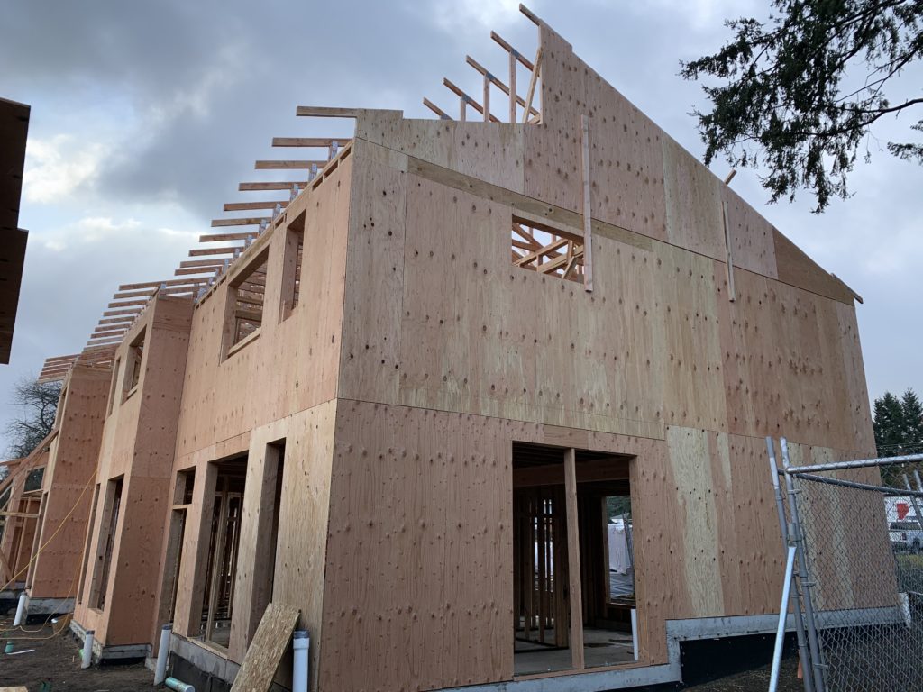 At this SE Hillsboro community, 8-homes— a five-plex and three-plex—are making their way through the framing stages. For the first time since the pandemic began in 2020, we invited a limited number of volunteers on-site to help us begin the process of framing, which will continue to happen throughout the month. Additionally, we are installing shingles, plumbing, and mechanical rough-ins.