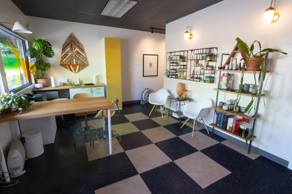 The waiting area of her healing center is adorned with locally made ceramics, tinctures, and indoor plants from her past life working at Pistol’s Nursery. The graphite illustrations along the back hallway are a reminder of the days when she hosted art gallery parties and community celebrations. While those days are not yet on the horizon, Kristen still sets her sights on the future of her work.