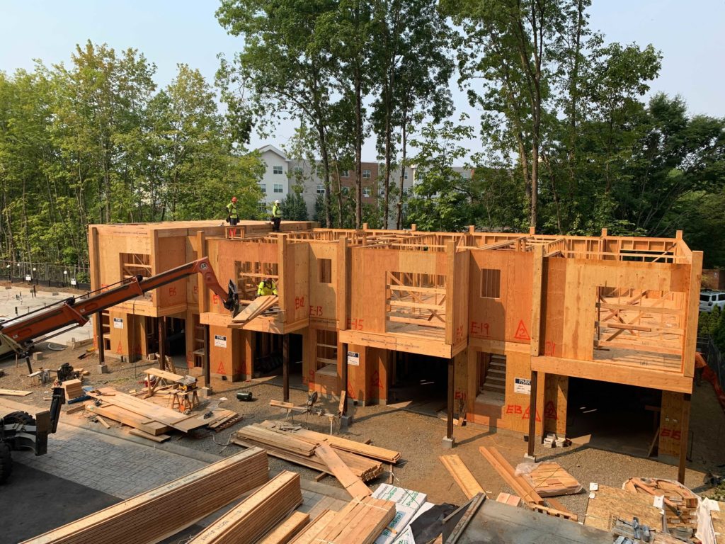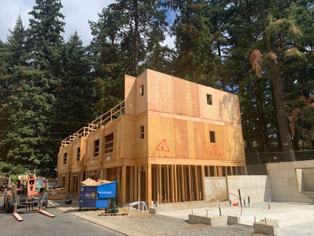 We’ve also finished integrating a fire sprinkler system throughout the building and wrapped a weather-resistant barrier around the building to protect it from Oregon’s wet and rainy seasons. Construction crews have also installed roofing and now mechanical rough-ins, which include the installation of ducting have recently been completed. Electrical installations like outlets and wires have been fitted throughout the building and city inspectors will visit the site. On the exterior, construction crews have paved the public sidewalk on the front side of the building.
