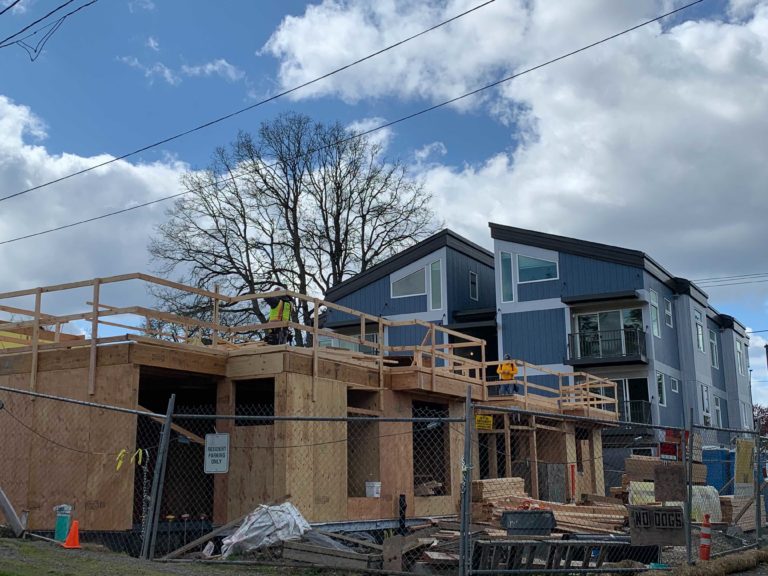 We are working to finish our last three structures (two triplexes and a duplex) at our Denney Gardens site in Beaverton, which will complete our 16-home community. One triplex is getting the finishing touches completed: plumbing and electrical fixtures, appliances, and hardware. Soon, we will begin installing carpet, leaving just a small list of items left to complete before new homebuyers can start moving in. Another triplex is nearing completion of framing and is moving into the rough-in phase for mechanical, electrical, and plumbing. The final building, a duplex, is almost done with the foundation work with under-slab insulation (a rigid foam insulation that diminishes the heat loss from the home into the ground) and utility installation, which will begin soon. We are excited to have our concrete crews begin pouring flatwork in a few weeks, quickly followed by framers.