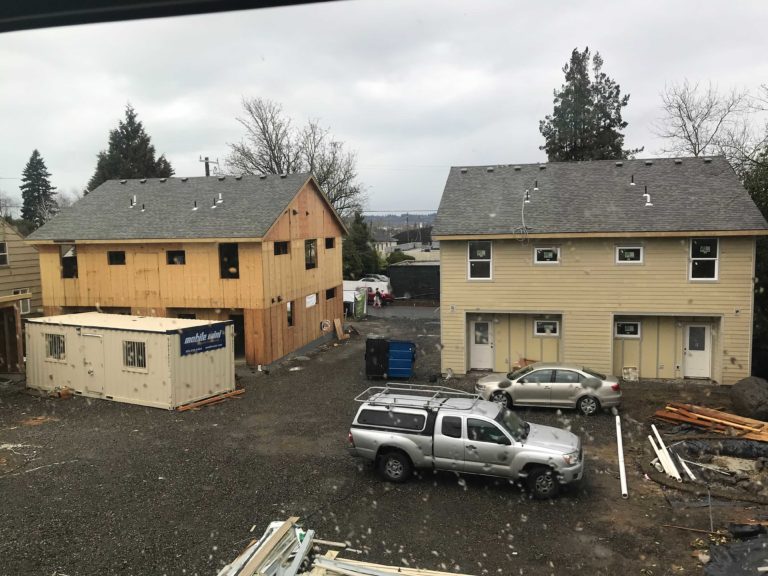 At our Simpson site located within the Cully neighborhood, construction on a 10-home community, consisting of two triplexes and two duplexes, continues in strides; plumbing, electrical and mechanical contractors are installing their finishes on the first duplex. Soon it will be ready for hardware and final punch list items such as fixing paint scratches or dents made during construction. Our two triplexes are done with drywall and are currently getting interior paint. Some finish carpentry is also underway including: cabinets, trim and door installations. The final duplex has also been insulated.