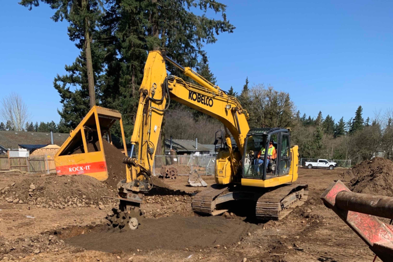 The face of one of our newest projects for affordable homes, located in SE Portland’s Powellhurst-Gilbert neighborhood, will soon become the center for a 40-home community. Over the past month we’ve cleared trees, brush, grass and weeds in order to make way for the foundation. In an effort to save some of the trees and large boulders our excavators find while digging the utility trenches, we plan to reuse them and create a natural play park for future homeowners to enjoy. On site, we are installing the storm and sanitary sewer systems, and plan to install the underground electrical service and water system next.