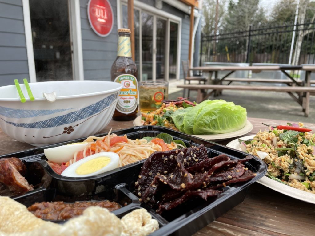 Slurping down garlicky noodles and crispy chicken skin at Cully Central today, you would never know a kitchen fire shut down the restaurant for three months last year. The spicy tang of papaya salad wafts from the kitchen; stringed lights glisten beside lampshades made from sticky rice basket cookers; the warmth from outdoor patio heaters pairs well with a glass of local brew. The atmosphere is warm and welcoming, like coming home to see family after a long time away. Owned and operated by Ae Sangasy and her brothers Narong Ittihrit and Nong Phimmoungkhoun, this neighborhood staple in Northeast Portland, serving Lao dishes passed down from family recipes, continues to persevere through a mountain of hurdles they’ve experienced since the pandemic hit.