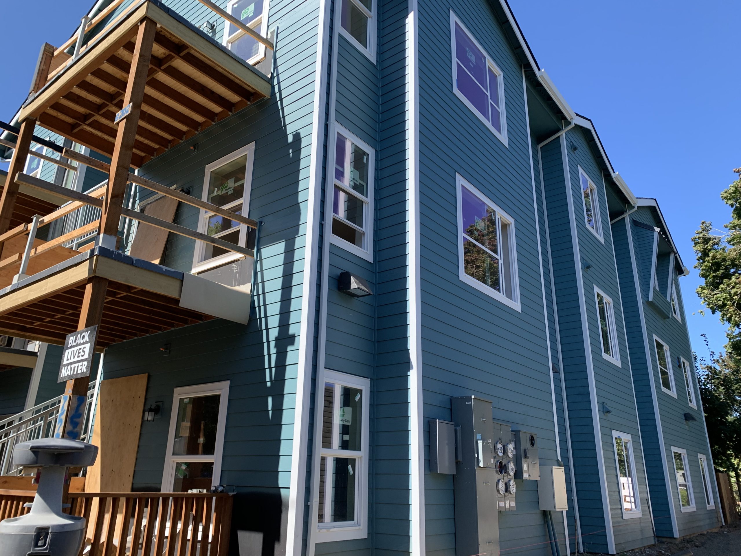 On the corner of North Lombard and Olin Avenue, 12 homes are nearing completion. Lights, water, and power are currently being installed while our crew works with the City to make street frontage improvements. We will pave a new sidewalk with an ADA-accessible ramp. From there, it comes down to the finishing touches before these homes are move-in ready later this year. All of the homes will be sold to people who have generational ties to North and Northeast Portland, as part of our work with the N/NE Preference Policy—a tool that helps address the harmful impacts of racist housing policies, marginalization and displacement.