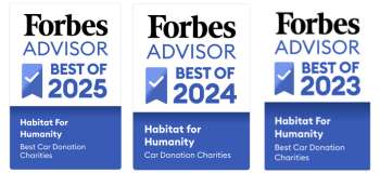 For 3 consecutive years, Forbes Advisor has named Habitat for Humanity’s Cars for Homes program one of the best vehicle donation programs in the nation! This award recognizes the efficiency and impact our vehicle donation program has on our local community. That means, each dollar generated by your vehicle donation helps serve more families right here in our community.
